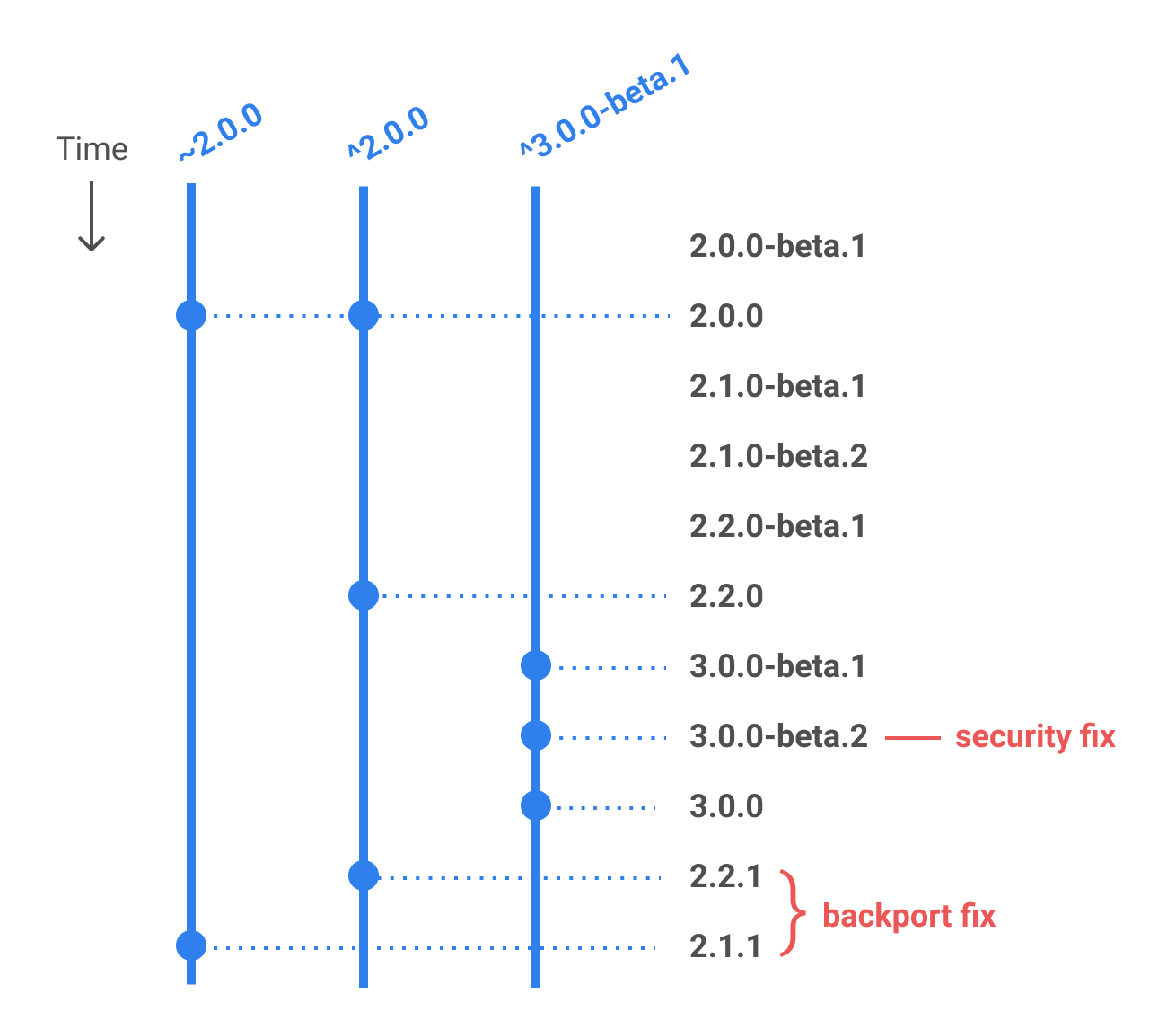 開発者はどのリリースが 安全 に使用できるかを知りたいものです。 一見無害な機能でさえ、複雑なアプリケーションに後退をもたらすことがあります。 同時に、あなたのバージョンから出るセキュリティパッチとバグ修正の可能性を無視しているので、固定バージョンへのロックは危険です。 私たちの目標は、package.json で以下のように標準的な semver 範囲を許可することです。